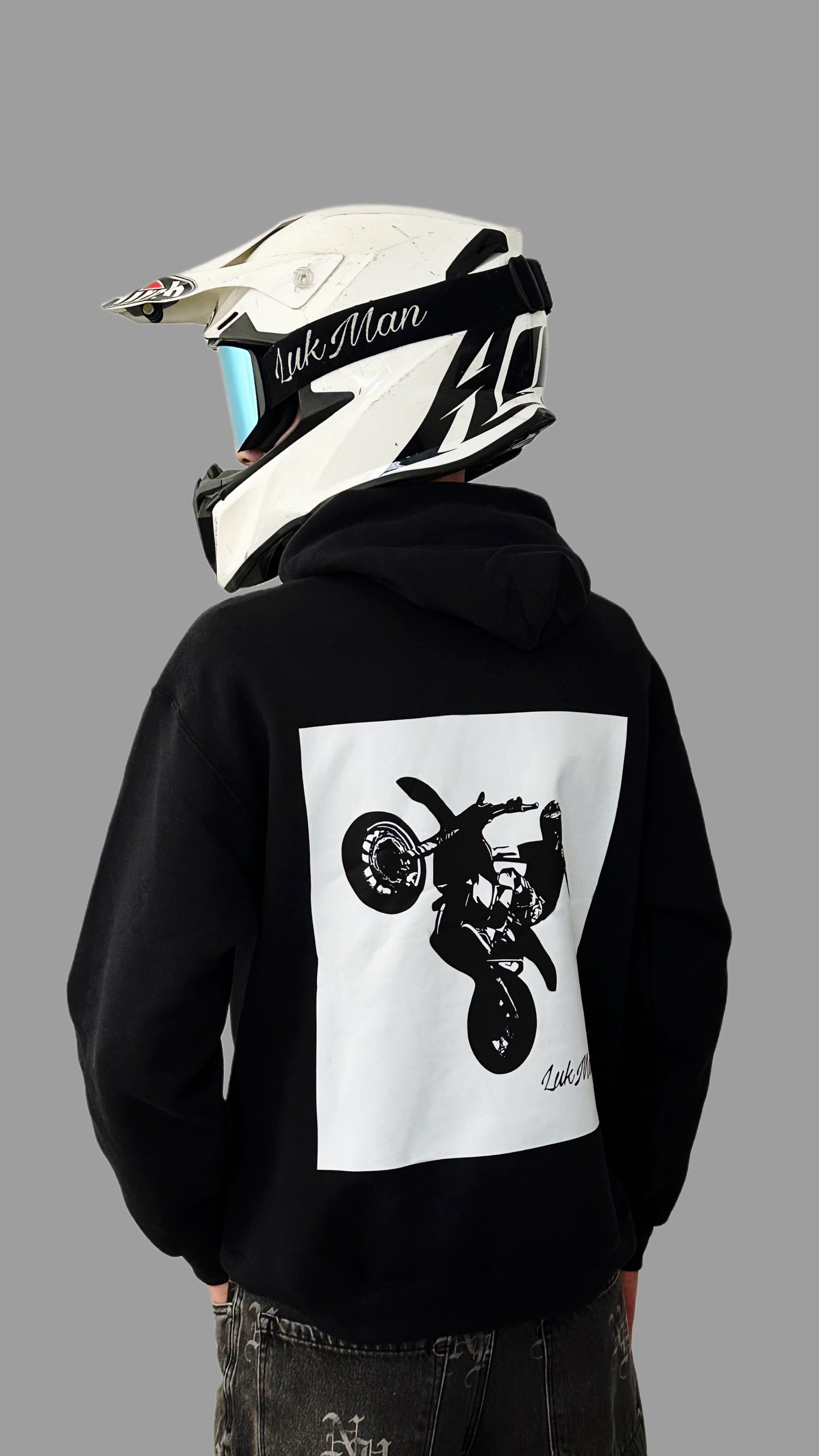 Esittelyssä laadukas ja tyylikäs mopoiluhuppari, joka yhdistää täydellisesti mukavuuden ja käytännöllisyyden. Tämä huppari on pehmeä ja miellyttävä päällä, mikä tekee siitä täydellisen valinnan mopoiluun tai rentoon vapaa-aikaan. Musta huppari, jossa näyttävä valkoinen selkäpainatus ja tyylikäs brodeeraus edessä.