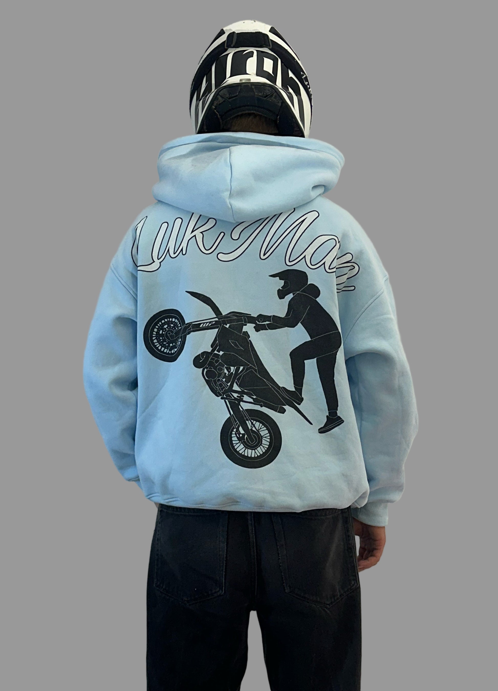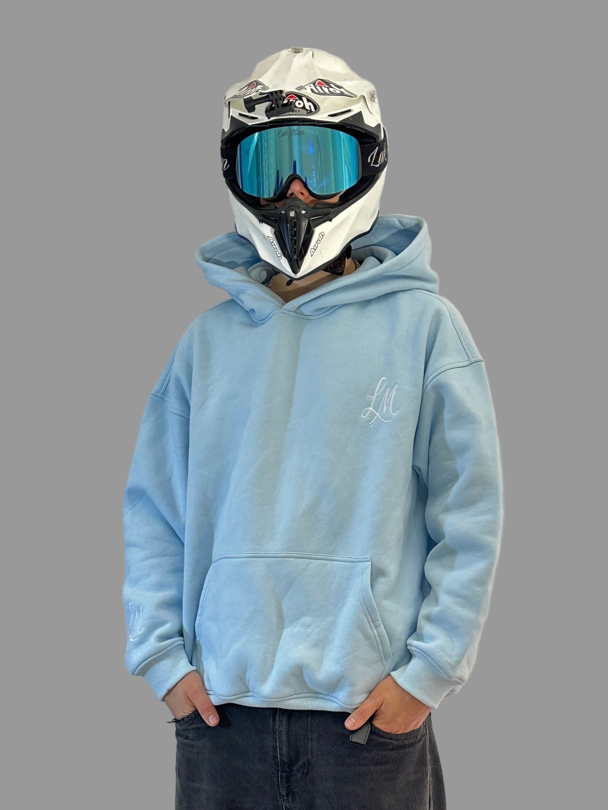 Vaaleansininen huppari, jossa näyttävä selkäpainatus, sekä brodeeratut logot hihassa sekä rinnassa.